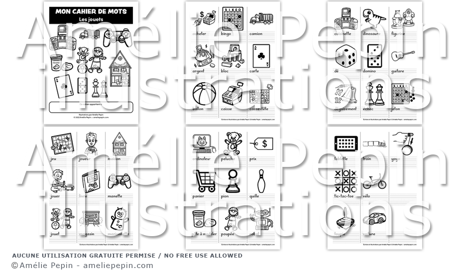 Use this document as a dictionary or as a word writing notebook in French. Children can color the drawings. Four versions are included: without lines, with sidewalk lines, double lines or calligraphic lines.