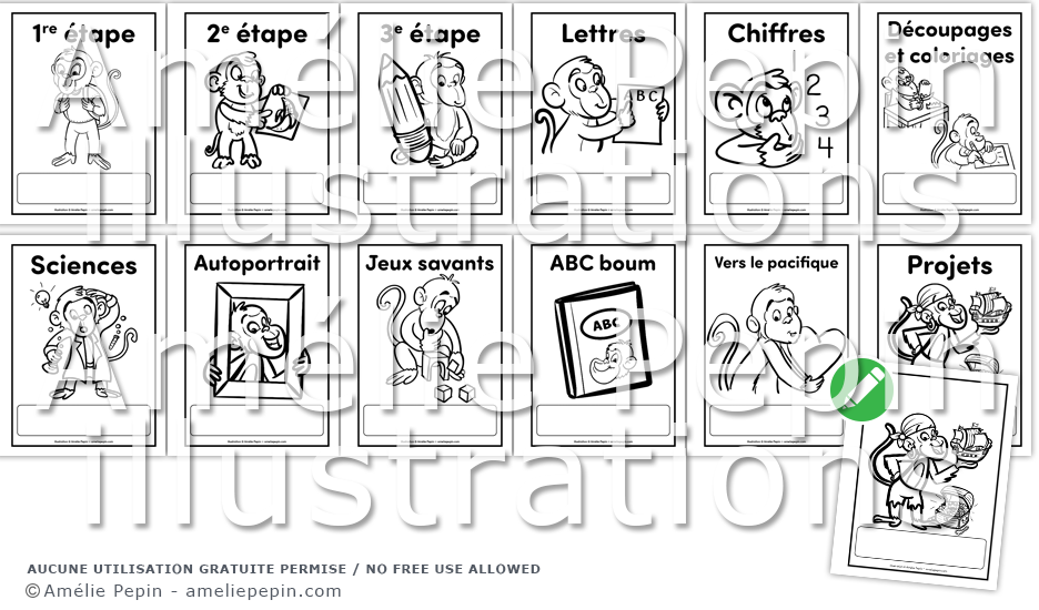 Here are 12 illustrated cover pages with monkeys to identify the Duo-tangs or notebooks. The titles written in French in the PDF version are: 1re étape, 2e étape, 3e étape, Autoportrait, Chiffres, Découpages et coloriages, Sciences, Lettres, Jeux savants, ABC boum, Vers le pacifique et Projets.