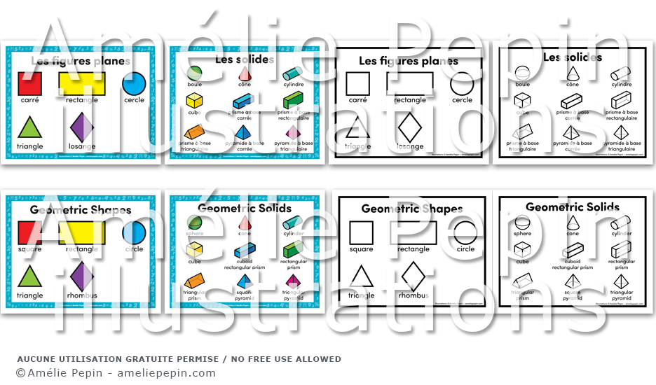 The file contains: - 1 poster illustrating the following geometric shapes: square, rectangle, triangle, circle, rhombus - 1 poster illustrating the following geometric solids: sphere, cone, cylinder, cube, cuboid (rectangular prism), rectangular prism, triangular prism, square pyramid, triangular pyramid