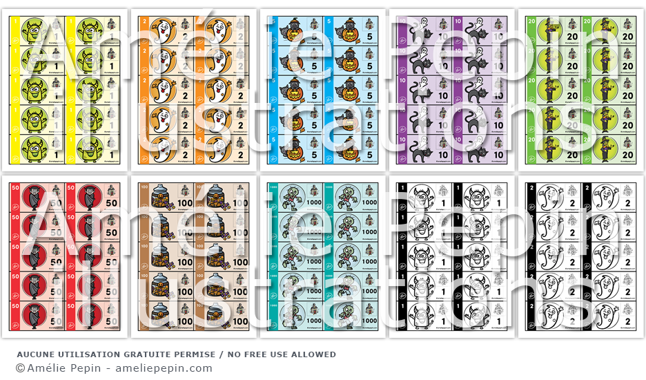 Illustrated bills of 1$, 2$, 5$, 10$, 20$, 50$, 100$ and 1000$. Save ink by printing the black and white version on colored paper.