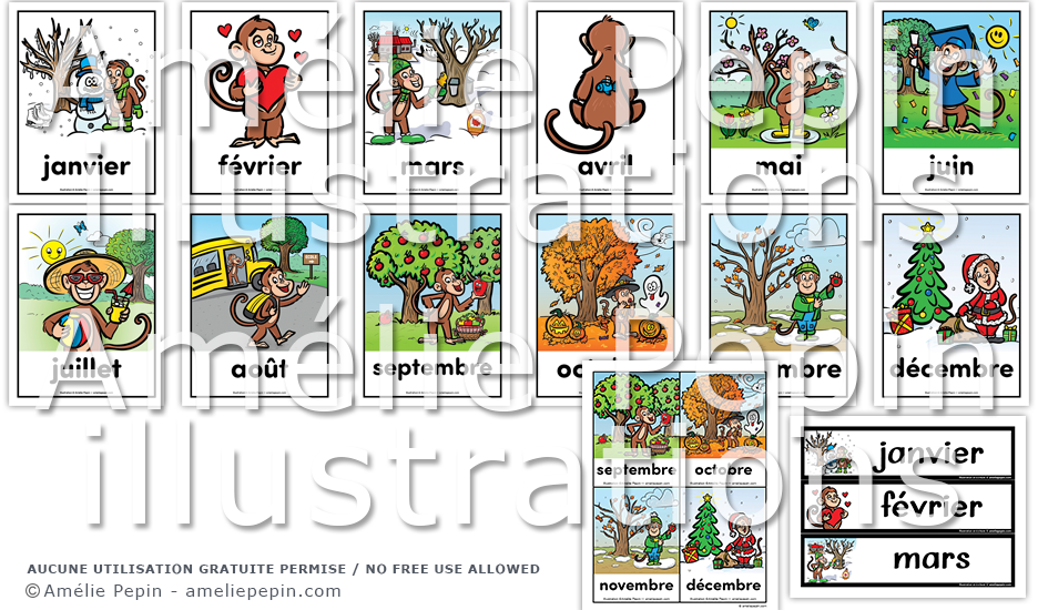 Les mois de l'année illustrés avec des singes et des arbres qui changent selon les saisons.