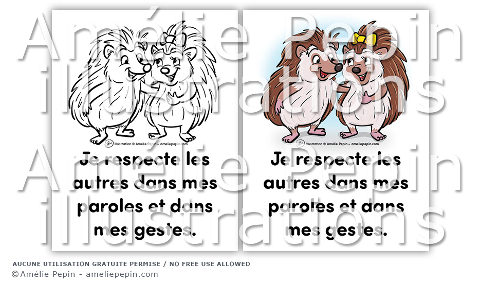 Règle de classe illustrée avec des hérissons: "Je respecte les autres dans mes paroles et dans mes gestes."