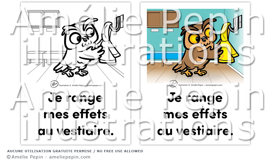 Règle de classe illustrée avec un hibou: "Je range mes effets au vestiaire."