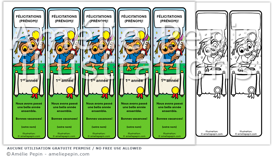 Signets aux coins arrondis illustrés avec un hibou très heureux d'avoir obtenu son diplôme de fin d'année scolaire.