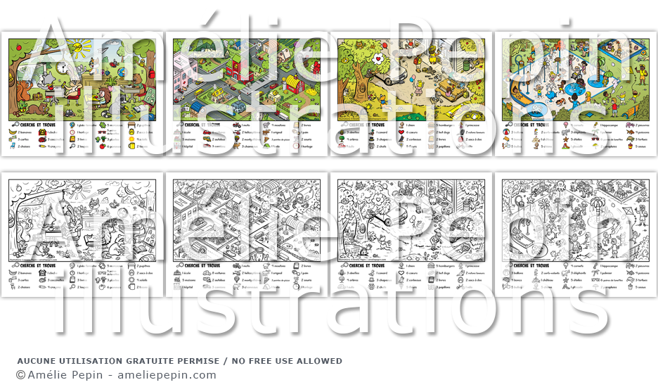 L'enfant cherche et trouve les éléments de la liste dans l'illustration. Les éléments à trouver sont illustrés pour aider l'enfant à apprendre leur nom. C'est un jeu qui développe le sens de l'observation, la concentration et le vocabulaire. Une version en noir et blanc est incluse et n'attend qu'à être coloriée! Les thèmes illustrés sont: une classe en forêt, la ville, le casse-croûte et les jeux d'eau.