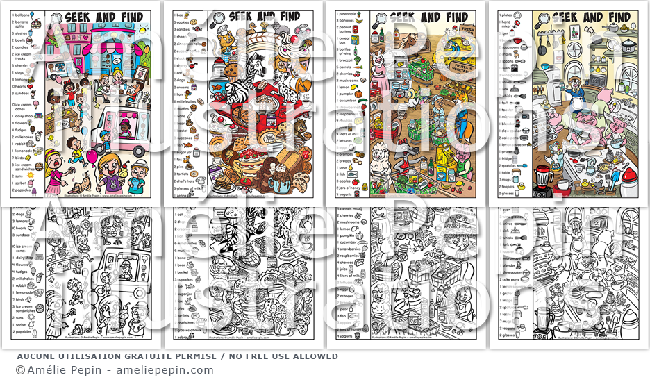 L'enfant cherche et trouve les éléments de la liste dans l'illustration. Les éléments à trouver sont illustrés pour aider l'enfant à apprendre leur nom. C'est un jeu qui développe le sens de l'observation, la concentration et le vocabulaire. Une version en noir et blanc est incluse et n'attend qu'à être coloriée! Les thèmes illustrés sont: le supermarché, les accessoires de cuisine, les desserts et les animaux, la crèmerie.