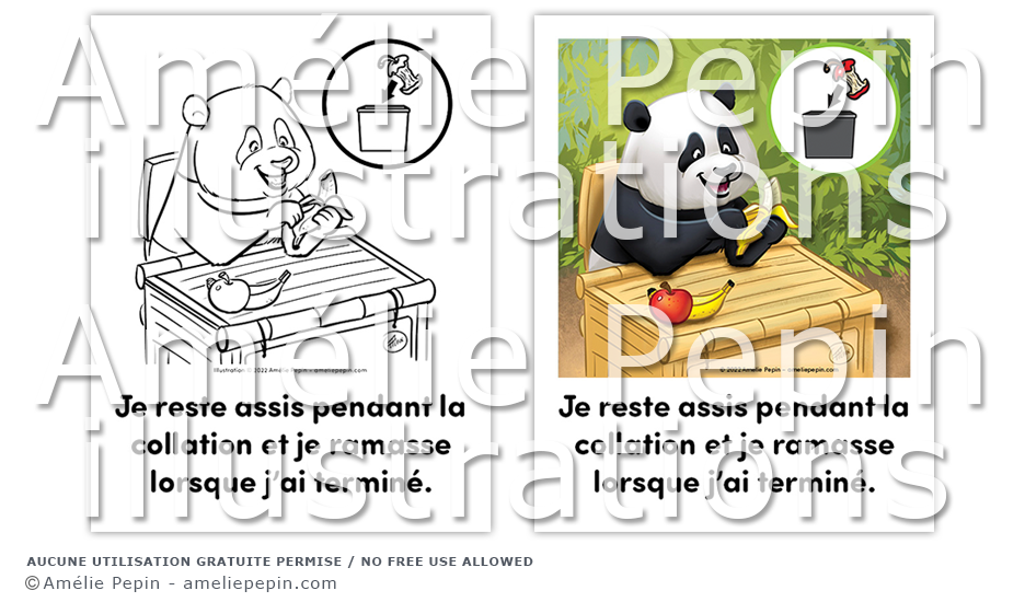 Règle de classe illustrée avec un panda: "Je reste assis pendant la collation et je ramasse lorsque j'ai terminé."