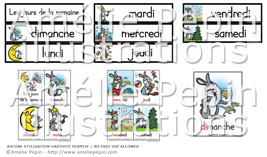 Chaque jour de la semaine est représenté par un lapin avec un élément dont le son débute par la première syllabe du jour (DImanche, DInosaure).
