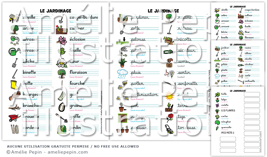 Liste de mots pour apprendre le vocabulaire en lien avec le jardinage, les fleurs et les plantes (72 mots sont illustrés). La classe de mots est écrite entre parenthèses sous chaque mot. Quatre versions sont incluses: sans ligne, avec lignes trottoirs, avec lignes doubles ou avec lignes calligraphiques. Quelques espaces sont prévus à la fin du document afin que l'enfant puisse s'exercer à écrire les mots de son choix. Vous pouvez utiliser cet ouvrage comme petit dictionnaire lorsque vous enseignez le thème des saisons.