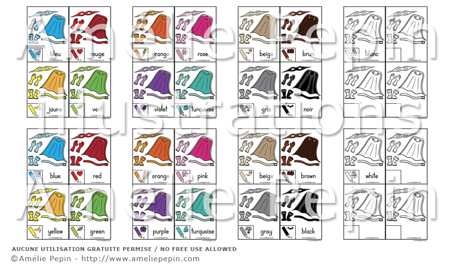 Idéal pour apprendre les couleurs ou encore pour diviser votre classe en équipes. Les couleurs représentées sont: bleu, rouge, jaune, vert, orange, rose, violet, turquoise, beige, brun, gris, noir et blanc. Cliquez sur "aperçu gratuit" afin de visualiser les pages.