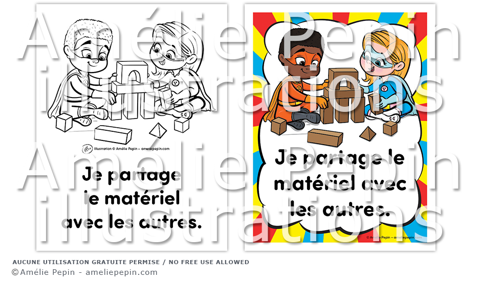 Règle de classe illustrée avec des superhéros: "Je partage le matériel avec les autres."