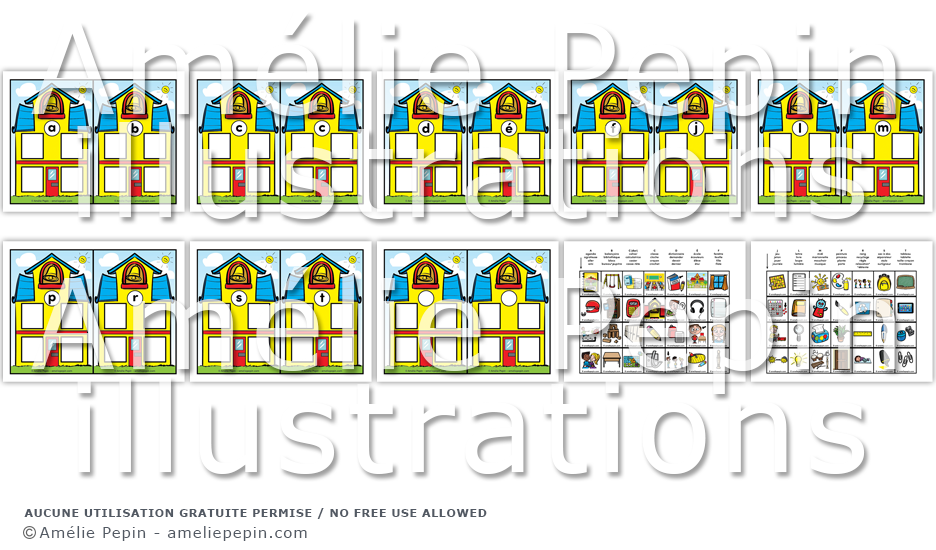 Chaque école contient un son vedette (a, b, c dur, c, d, é, f, j, l, m, p, r, s, t). L'enfant place quatre images dans l'école dont le nom débute par la lettre vedette. Par exemple, pour la lettre a, l'enfant place les images: agenda, agrafeuse, aller, ami. Certaines images peuvent être placées à différents endroits selon le mot perçu par l'enfant, il est donc important de lui demander le nom de l'image si vous ne les mentionnez pas. La liste des mots est inscrite sur les pages d'illustrations.