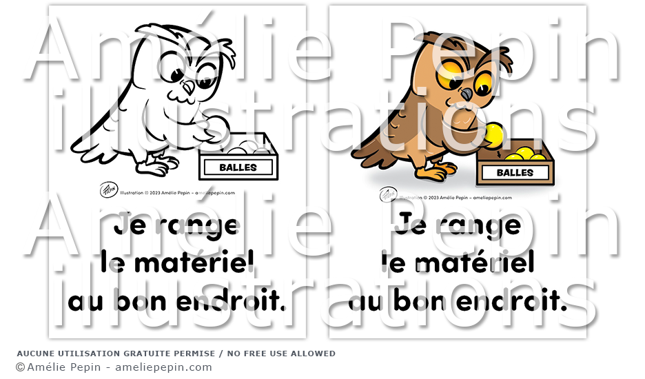 Règle de classe illustrée avec un hibou: "Je range le matériel au bon endroit."