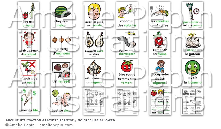 Voici 20 affiches illustrées pour travailler quelques expressions populaires en lien aux fruits et aux légumes. Vous pouvez les regarder sur TNI ou les imprimer. Beau sujet de conversation pour le thème de l'alimentation! Parmi ces expressions, on retrouve: "être une asperge", "chapeau melon", "avoir les yeux en amande", "raconter des salades", "les carottes sont cuites", "poireauter", "avoir un coeur d'artichaut", "la cerise sur le gâteau", "être rouge comme une tomate", "Occupe-toi de tes oignons!" et bien d'autres.