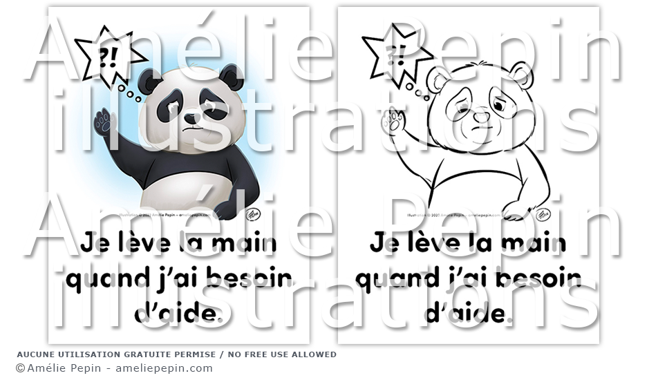 Règle de classe illustrée avec un panda: "Je lève la main quand j'ai besoin d'aide."