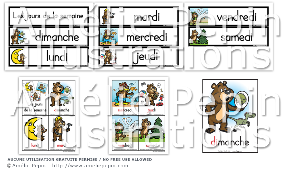 Chaque jour de la semaine est représenté par un ours avec un élément dont le son débute par la première syllabe du jour (DImanche, DInosaure).