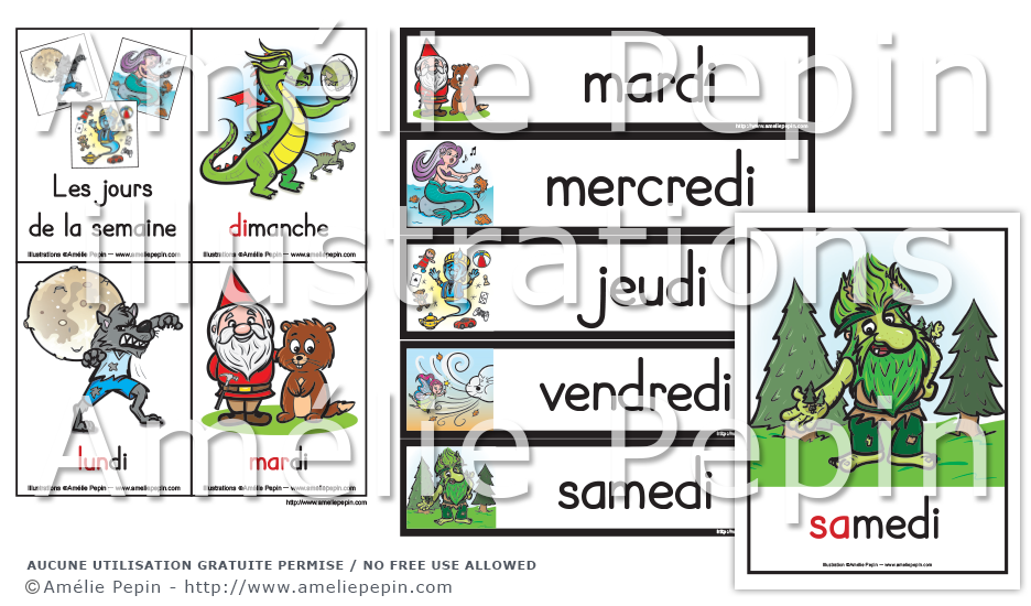 Mots-étiquettes des jours de la semaine représentés par des créatures légendaires.