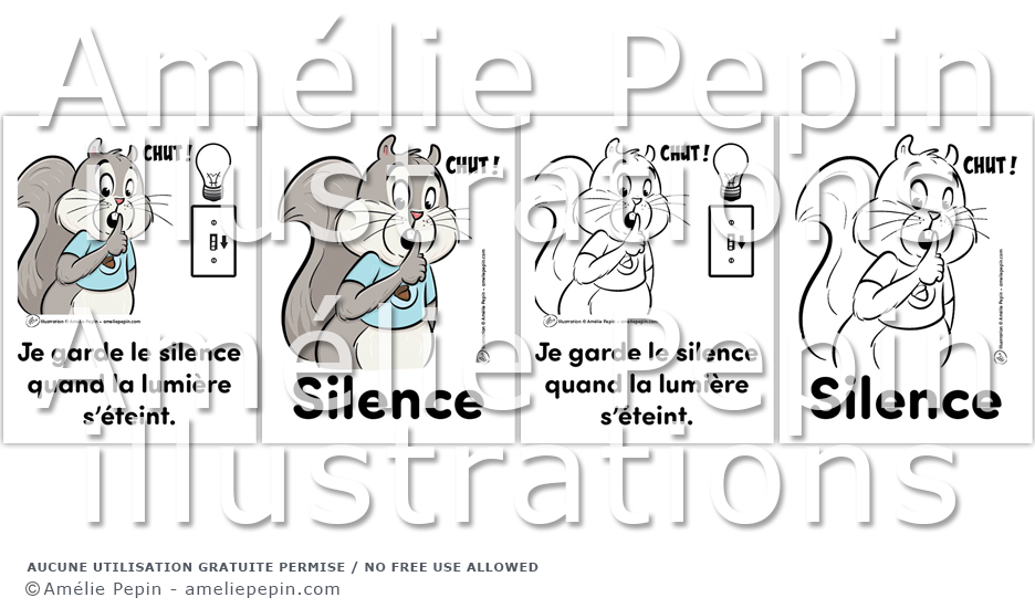 Règles de classe illustrées avec des écureuils: "Silence" et "Je garde le silence quand la lumière s'éteint."