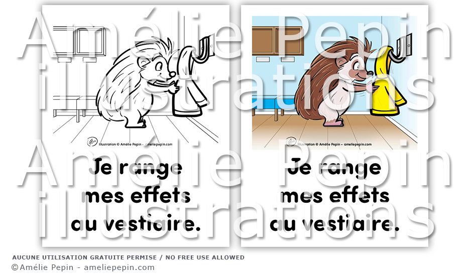 Règle de classe illustrée avec un hérisson: "Je range mes effets au vestiaire."