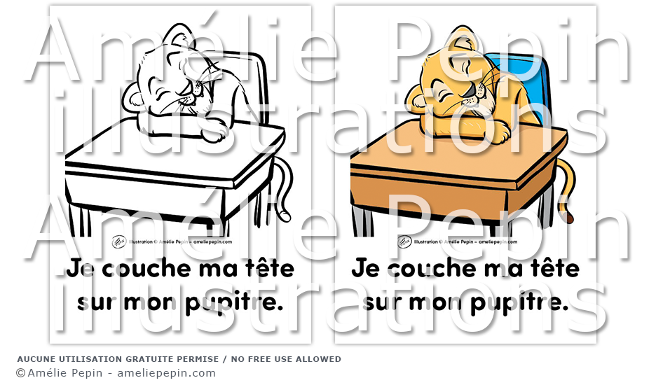 Règle de classe illustrée avec un lionceau: "Je couche ma tête sur mon pupitre."