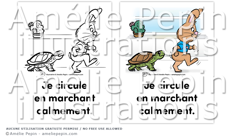 Règle de classe illustrée avec un lapin et une tortue: "Je circule en marchant calmement."