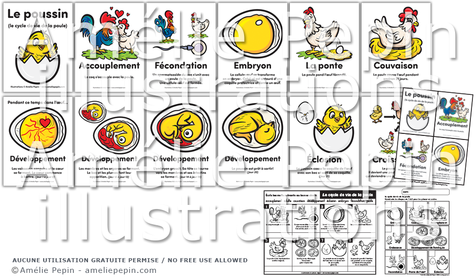 - Le cycle de vie de la poule: Nomme les étapes (L'enfant écrit les étapes du cycle de vie de la poule au bon endroit. Les descriptions des huit étapes sont inscrites sous chaque illustration. Un corrigé est offert.)