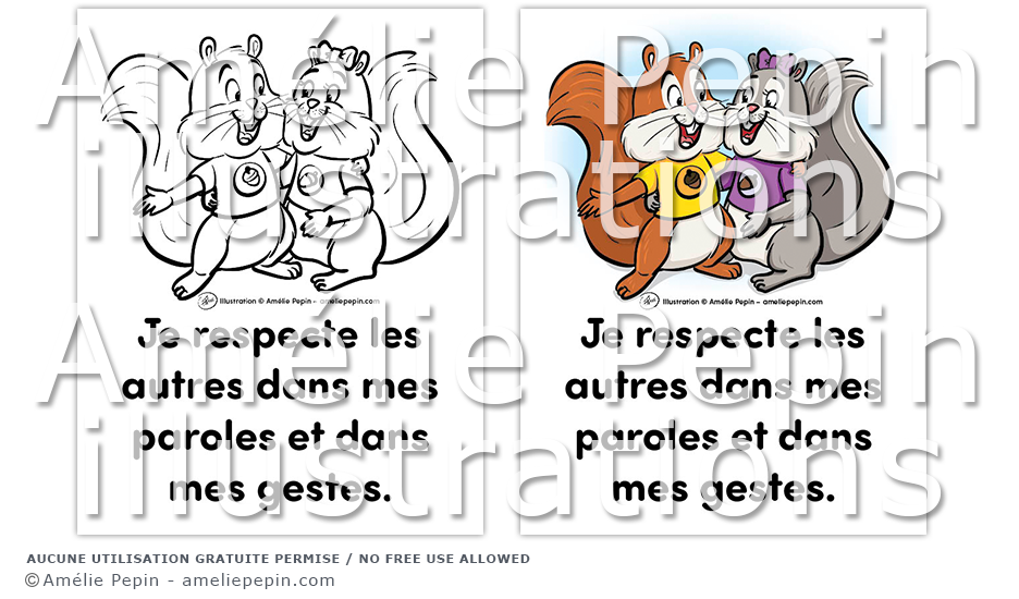 Règle de classe illustrée avec des écureuils: "Je respecte les autres dans mes paroles et dans mes gestes."