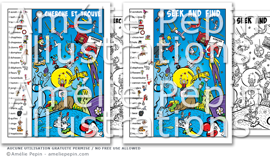 L'enfant cherche et trouve les éléments de la liste dans l'illustration. Les éléments à découvrir sont illustrés pour aider l'enfant à apprendre leur nom. C'est un jeu qui développe le sens de l'observation, la concentration et le vocabulaire. L'enfant compte également les éléments jusqu'à six. Découvrez les personnages du cirque dans cette illustration. Une version en noir et blanc est incluse et n'attend qu'à être coloriée!