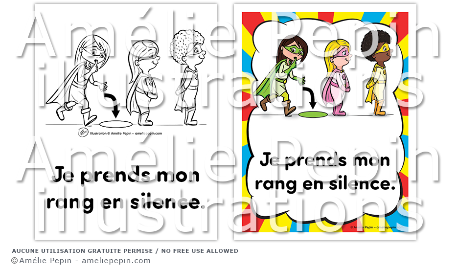 Règle de classe illustrée avec des superhéros: "Je prends mon rang en silence."