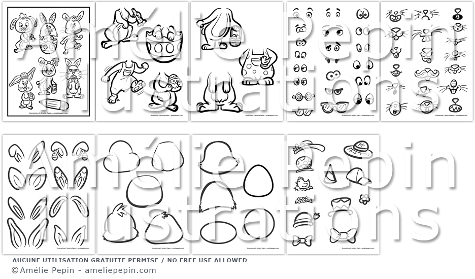 L'enfant crée son lapin en choisissant parmi les différents corps, têtes, yeux, bouches et autres éléments de ce document. Libre à lui de décorer son lapin selon sa créativité et même d'ajouter d'autres éléments. Les lignes sont épaisses pour être calquées facilement. Vous pouvez coller les pages sur une fenêtre pour remplacer une tablette lumineuse. Ceci est une façon d'apprendre à dessiner et à développer sa créativité. Vous pouvez également découper les différentes parties pour créer un collage. Il est important que l'enfant commence par dessiner ou par coller le corps en bas de page afin d'avoir suffisamment d'espace pour ajouter les autres parties du personnage.