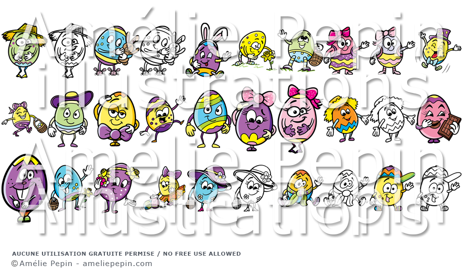 Ce dossier contient 24 personnages joyeux en cocos de Pâques qui font des actions différentes pour décorer vos documents ou votre pièce.