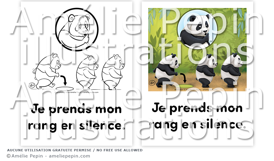 Règle de classe illustrée avec des pandas: "Je prends mon rang en silence."