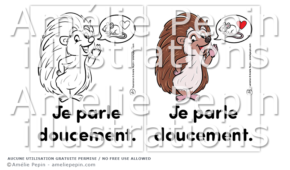 Règle de classe illustrée avec un hérisson: "Je parle doucement."