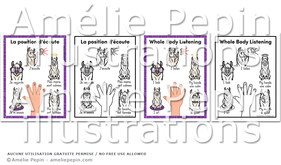Affiches qui illustrent la position d'écoute avec des lamas. Chaque fichier contient une affiche par page, deux affiches par page et quatre affiches par page. Versions en couleurs et en noir et blanc offertes.