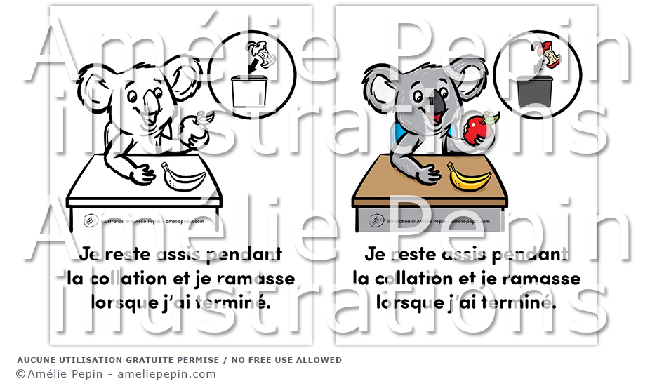 Règle de classe illustrée avec un koala: "Je reste assis pendant la collation et je ramasse lorsque j'ai terminé."