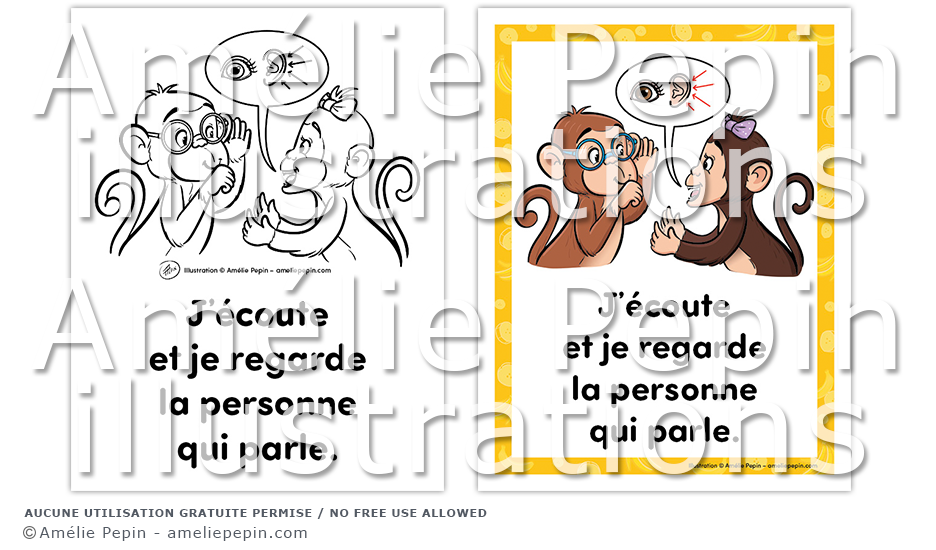 Règle de classe illustrée avec des singes: "J'écoute et je regarde la personne qui parle."