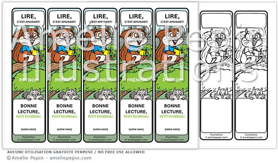 Signets aux coins arrondis illustrés avec un écureuil assis sur un arbre qui lit un livre tandis qu'un autre écureuil souriant tient un écriteau. Les textes suggérés que vous pouvez changer sur le signet sont: «Lire, c'est amusant!» et «Bonne lecture, petit écureuil!».
