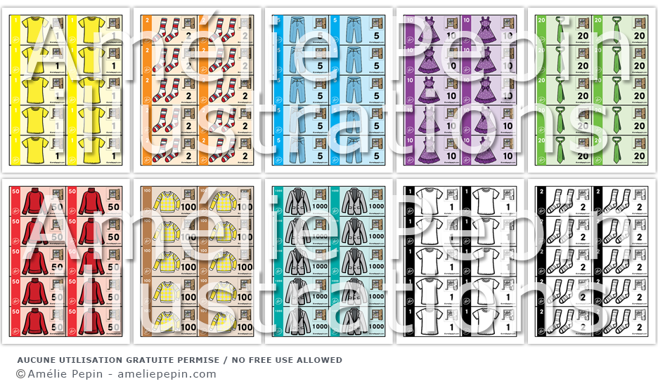 Ces documents contiennent les billets de 1$, 2$, 5$, 10$, 20$, 50$,100$ et 1000$. Sauvez de l'encre en imprimant la version en noir et blanc sur du papier teinté.