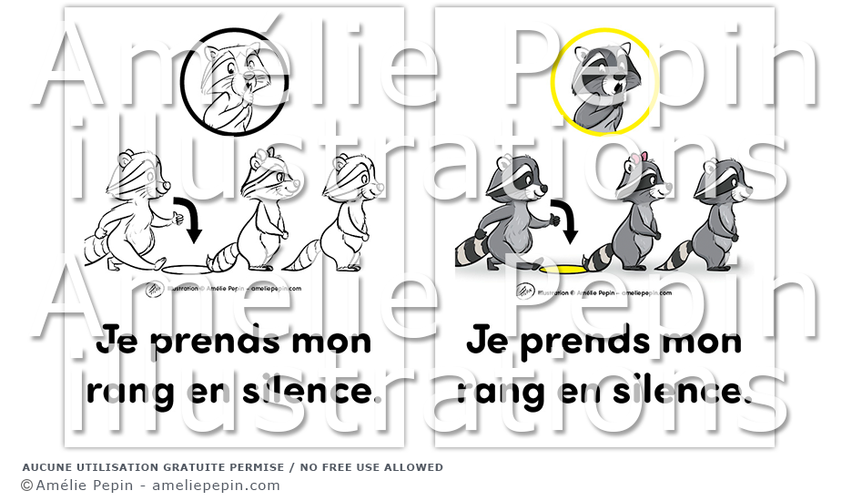 Règle de classe illustrée avec des ratons laveurs: "Je prends mon rang en silence."