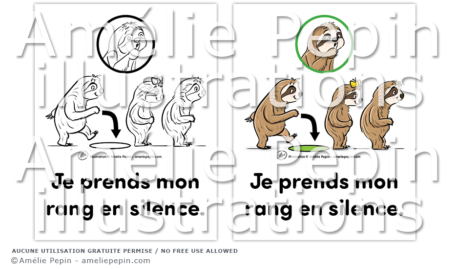 Règle de classe illustrée avec des paresseux: "Je prends mon rang en silence."