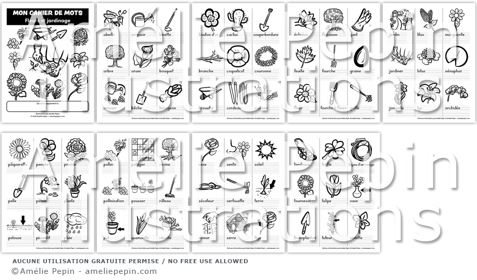 Utilisez ce document en tant que recueil de mots illustrés (dictionnaire) ou comme cahier d'écriture de mots sur le thème des fleurs et du jardinage. Les enfants peuvent colorier les dessins. Quatre versions sont incluses: sans lignes (rectangles pour écrire), avec lignes trottoirs, lignes doubles ou lignes calligraphiques.