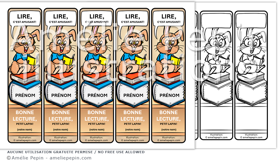 Signets aux coins arrondis illustrés avec un lapin assis sur une pile de livres. Les textes suggérés que vous pouvez changer sur le signet sont: «Lire, c'est amusant!» et «Bonne lecture, petit lapin!».