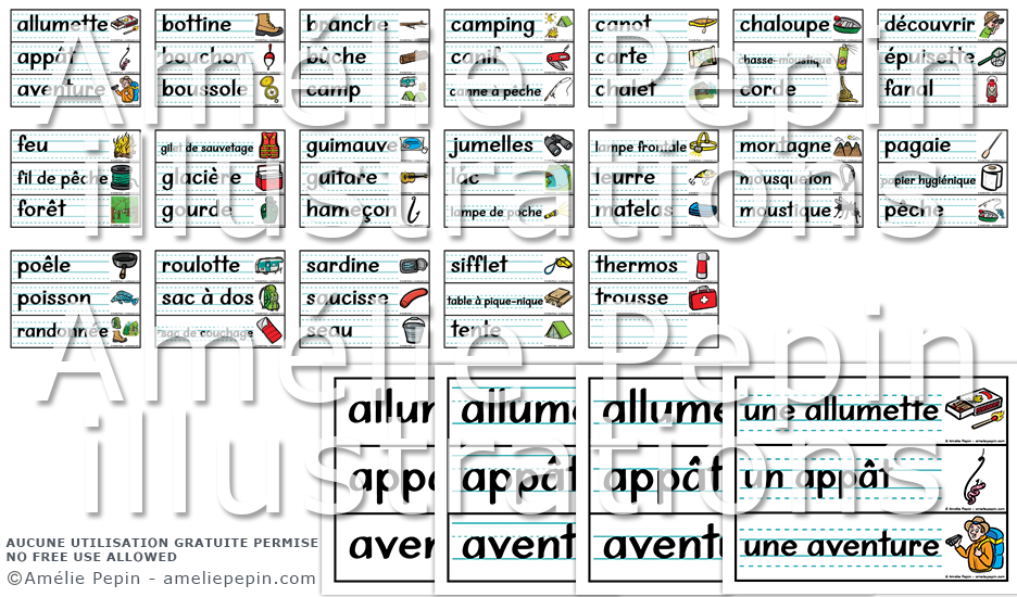 Les mots illustrés sont: allumette, appât, aventure, bottine, bouchon, boussole, branche, bûche, camp, camping, canif, canne à pêche, canot, carte, corde, découvrir, épuisette, fanal, feu, fil de pêche, forêt, gilet de sauvetage, glacière, gourde, guimauve, guitare, hameçon, jumelles, lac, lampe de poche, lampe frontale, leurre, matelas, montagne, mousqueton, moustique, pagaie, papier hygiénique, pêche, poêle, poisson, randonnée, roulotte, sac à dos, sac de couchage, sardine, saucisse, seau, sifflet, table à pique-nique, tente, thermos, trousse.