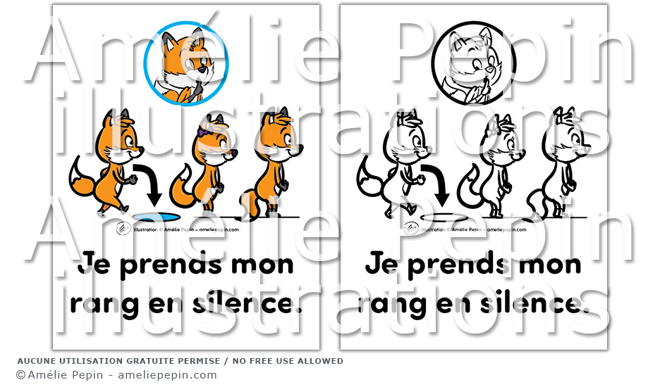 Règle de classe illustrée avec des renards: "Je prends mon rang en silence."