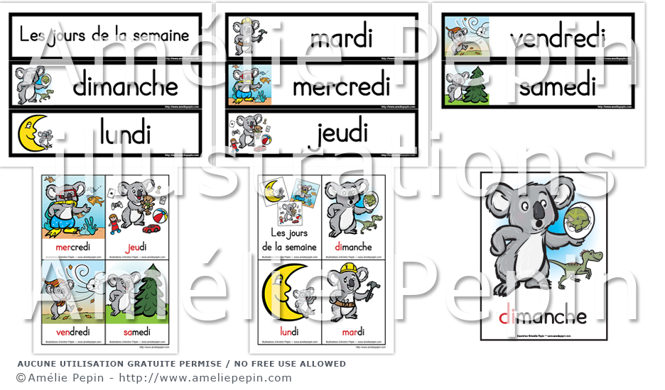 Chaque jour de la semaine est représenté par un koala avec un élément dont le son débute par la première syllabe du jour (DImanche, DInosaure).