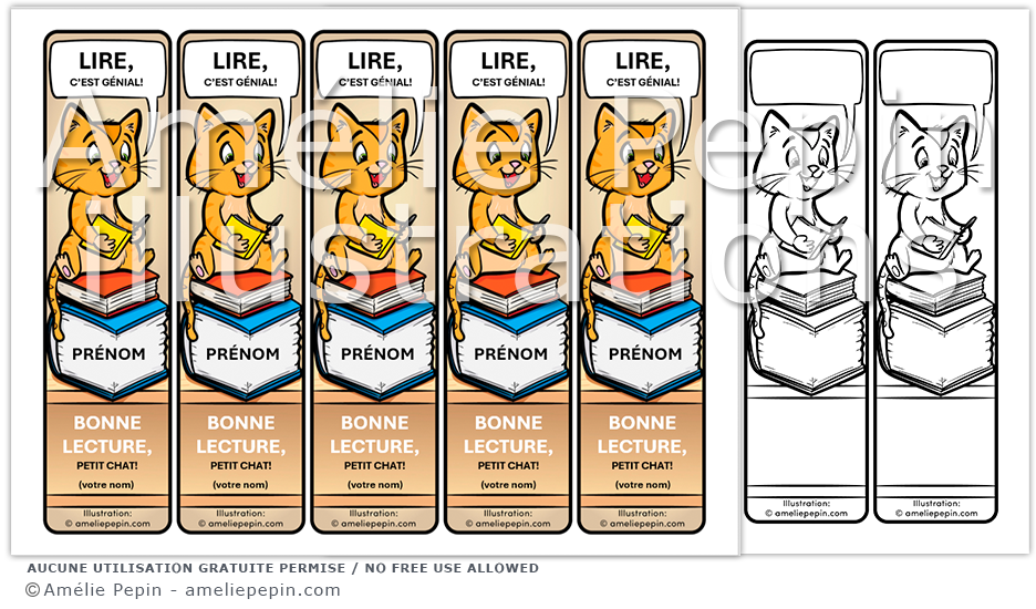 Signets aux coins arrondis illustrés avec un chat assis sur une pile de livres. Les textes suggérés que vous pouvez changer sur le signet sont: «Lire, c'est génial!» et «Bonne lecture, petit chat!».