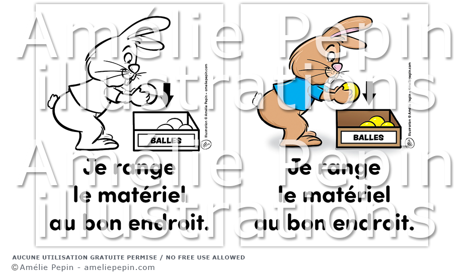 Règle de classe illustrée avec un lapin: "Je range le matériel au bon endroit."