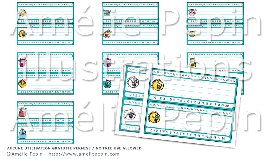 Chaque étiquette contient les lettres de l'alphabet en script avec les voyelles écrites en rouge, un trottoir pour écrire le prénom de l'enfant ainsi que les nombres de 0 à 20. Dans la seconde version, l'enfant peut colorier son monstre.