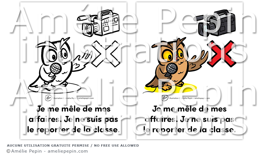 Règle de classe illustrée avec un hibou: "Je me mêle de mes affaires. Je ne suis pas le reporter de la classe."
