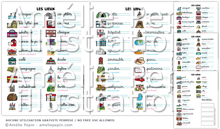 Les mots illustrés sont: aéroport, bibliothèque, boutique, bureau de poste, café, caserne, cimetière, église, cinéma, clinique, crèmerie, école, forêt, garage, gratte-ciel, gymnase, hôpital, hôtel, immeuble, jardin, magasin, mairie, maison, musée, parc, patinoire, pharmacie, piscine, plage, port, poste de police, prison, restaurant, stade, station-service, supermarché, théâtre, université, usine, verger, ville, zoo, lieu, cabane à sucre, campagne, cathédrale, caverne, château, désert, ferme, grotte, igloo, maison hantée, mine, monastère, pyramide, royaume, village, ville, pays, monde.